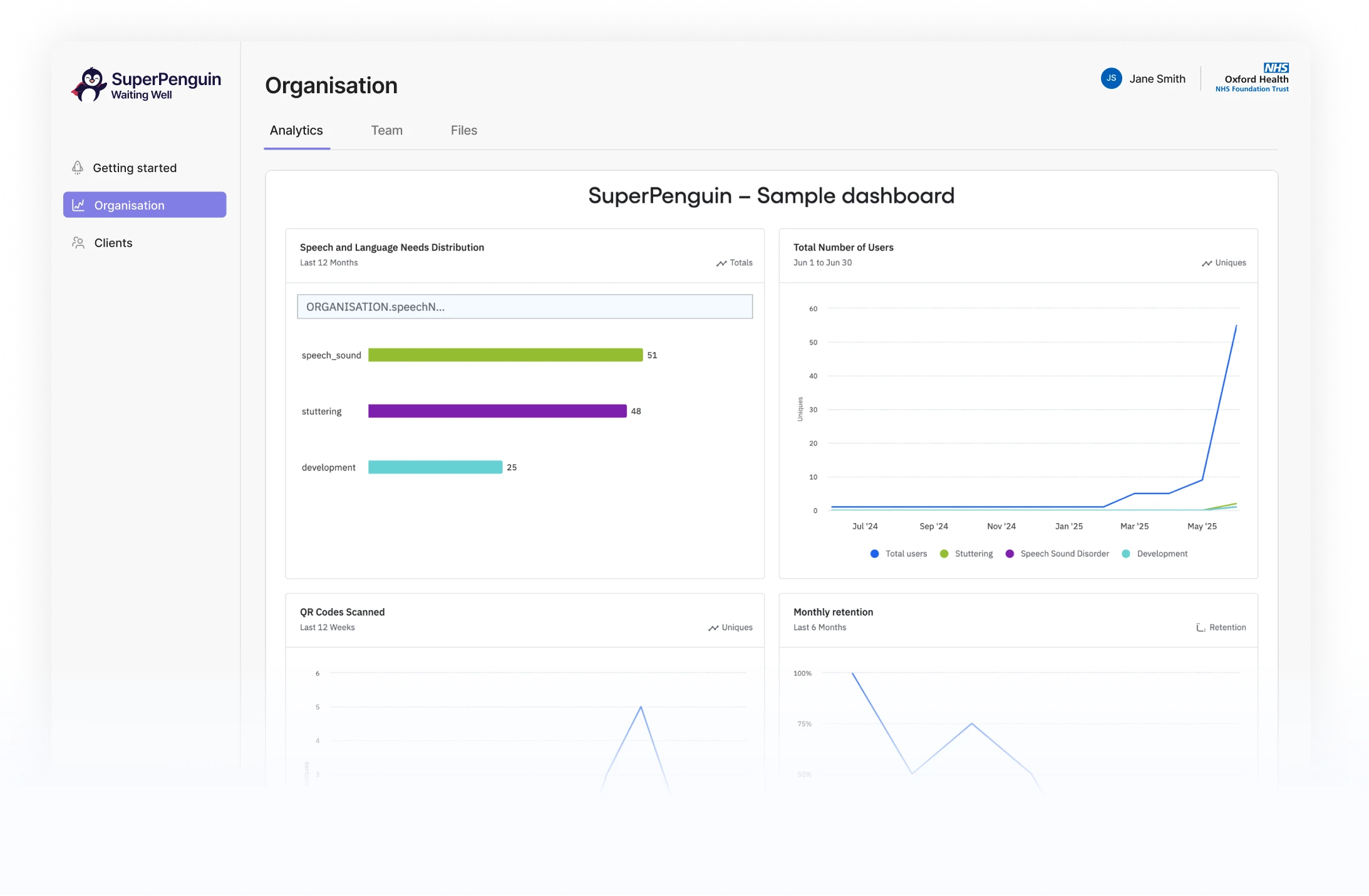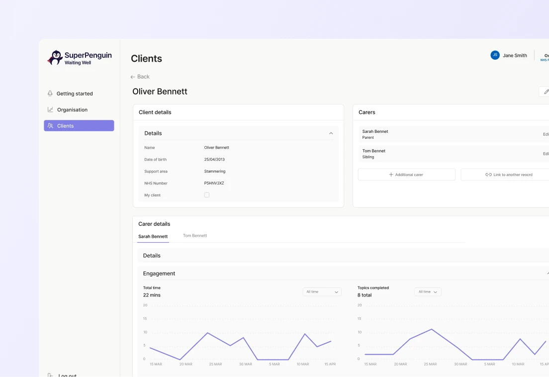 The SuperPenguin dashboard provides all the information you need on your organisation’s use of SuperPenguin, from high level insights to details on each client, for bespoke care.